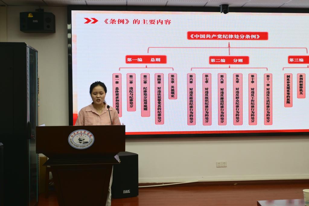 “加强纪律性,革命无不胜”。纪律严明是党的光荣传统和独特优势,正是靠着严明的纪律和规矩,中国共产党才能不断取得革命、建设和改革事业的伟大胜利。集体学习中,支部宣传委员杨培妍以《学党纪,强党性》为题展开党课讲授,为与会党员同志解读《中国共产党纪律处分条例》(下文简称《条例》),从适用范围、历次修订情况、主要内容展开,系统介绍《条例》的整体概况,为支部同志会后的自主学习奠定基础。随后,杨培妍就《条例》内容逐章解读,号召支部党员同志“要坚持提高站位学、逐章逐条学、带着使命学、联系实际学”。在学习现场,支部党员同志认真听讲,细致批注,积极深化对《条例》理解和掌握。