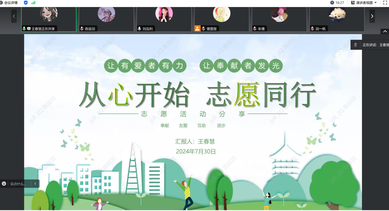第二项,分享志愿服务心得。支部的王春慧同学以“从心开始,志愿同行”为题分享了自己参与志愿活动的心得体会。她从志愿活动的信息获取、实践经验及内心感悟三个方面展开分享。首先,她介绍了志愿服务的种类和报名渠道,鼓励大家积极关注相关活动信息并参与到各种形式的志愿服务活动中去。其次,她分享了自己参与志愿服务的经验,并详细阐述了志愿服务过程中的注意事项和收获。最后,她强调,志愿服务不仅是对社会的贡献,更是个人成长的重要途径。通过志愿服务,我们可以增强社会责任感,提升自我价值,拓宽视野,丰富人生经历。