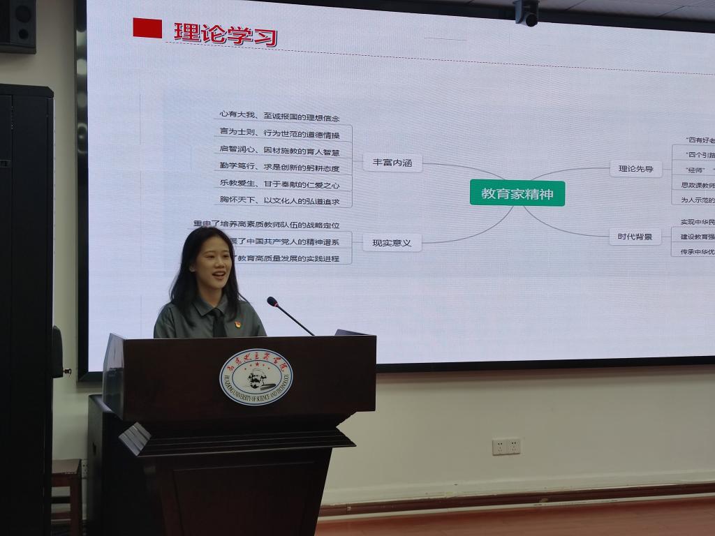 会议伊始,刘孟迪领学《中共中央 国务院关于弘扬教育家精神加强新时代高素质专业化教师队伍建设的意见》(以下简称《意见》),她运用思维导图概括了《意见》的具体内容,并就教育家精神的时代背景、丰富内涵、理论先导和现实意义进行重点讲解。随后,研究生红色理论学讲团团长赵羡文以《光“因”的故事——教育、科技、人才在发展新质生产力中的良性循环》为题和与会同志分享了yl23411以一束激光点亮“武汉·中国光谷”并与其共生、共兴、共荣的奋斗历程,论述了在新质生产力发展中畅通教育、科技、人才良性循环的重要性。