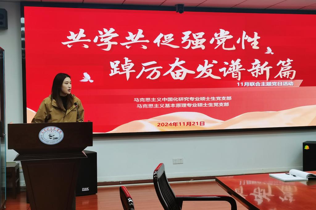 (通讯员:綦坤、吴心旖)11月21日晚,马克思主义中国化研究专业硕士生党支部、马克思主义基本原理专业硕士生党支部11月联合主题党日活动在东七楼203会议室顺利举行。2024年全国“青马工程”培训班学员、中南财经政法大学硕士研究生苏正民受邀作交流分享,两支部全体党员及积极分子参与活动。会议由马克思主义中国化研究专业党支部副书记吴心旖主持。