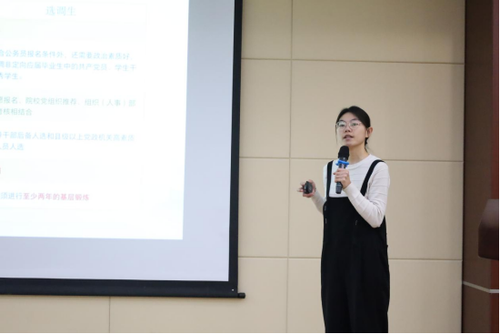 活动伊始,校基层治理研究会韩欣雨同志以《选调生政策赋能职业发展——从政策解读到实战备考》为题展开宣讲。她介绍了选调生与公务员的异同、培养优势及职业发展路径,通过对比选调生四类招录模式并结合各省报考案例与数据,进一步剖析了各省份的选调生招录特点与竞争趋势。针对备考实战,韩欣雨系统梳理了招录流程及考核形式,并建议大家提早准备笔试和面试,善用校方资源及社会就业信息平台,多省报考以提升成功率,为基层治理注入青年力量。