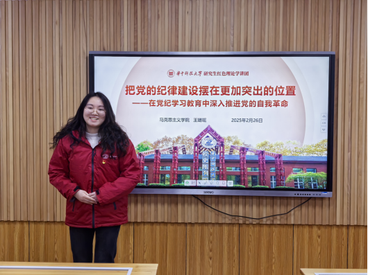 在理论学习环节,校研究生红色理论学讲团讲师、党支部成员王璐瑶以“把党的纪律建设摆在更加突出的位置——在党纪学习中深入推进党的自我革命”为题,从党的纪律建设的理论与历史逻辑切入,通过回溯党“每到关键时刻抓纪律”的生动实践,充分展现党在不同历史时期对纪律建设的传承和发展,让支部党员深刻认识到纪律建设关乎党的兴衰成败,是党应对各种风险挑战、保持旺盛生命力的关键所在。