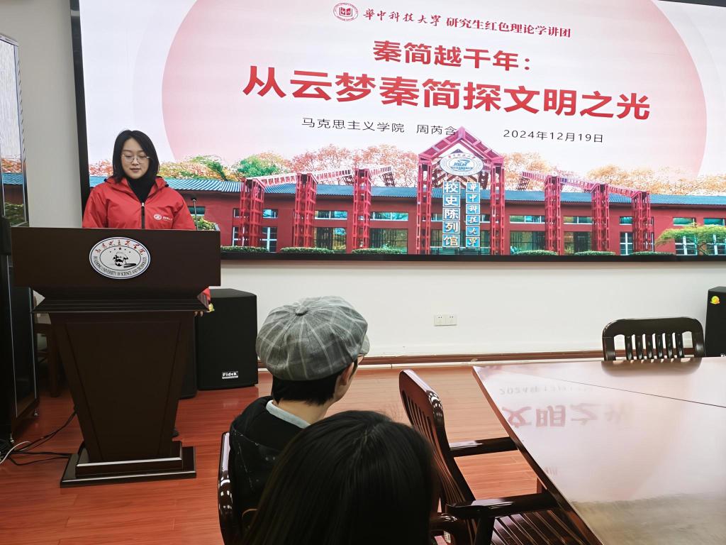 活动伊始,研究生红色理论学讲团讲师周芮含以《秦简越千年:从云梦秦简看文明之光》为题,为大家带来了一场精彩纷呈的宣讲,周芮含以简明扼要的方式,带领支部成员深刻认识到宪法在国家治理中的重要作用,并呼吁同学们为建设社会主义法治国家贡献青春力量。