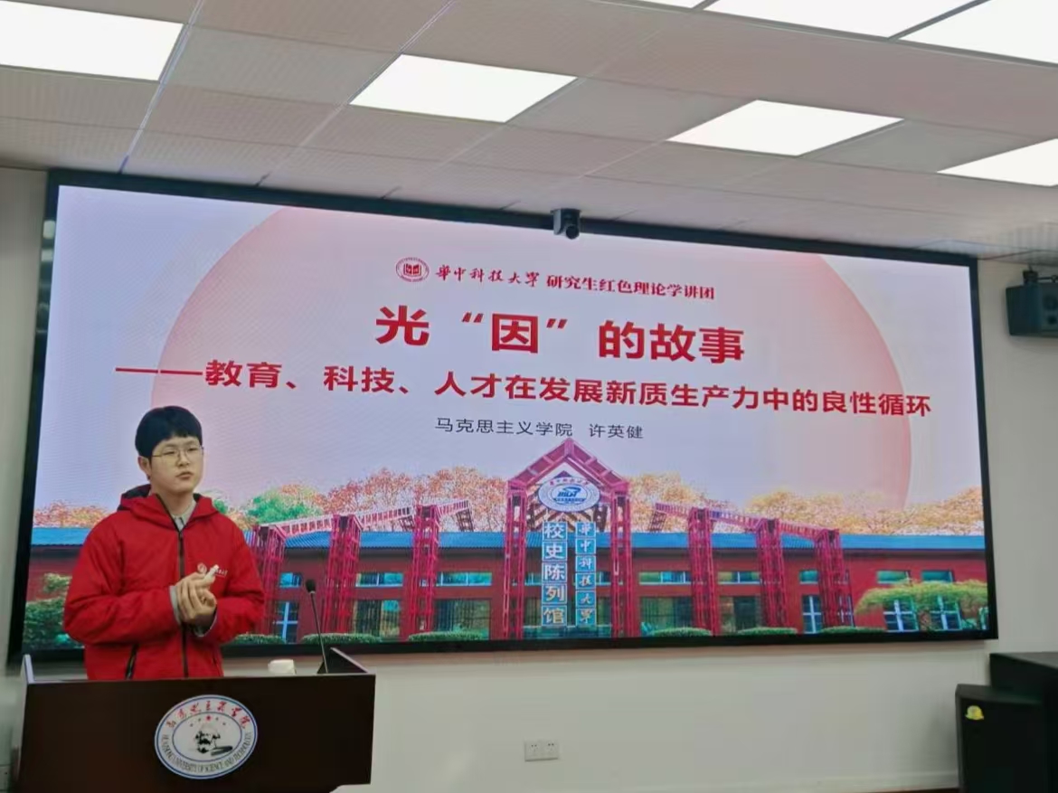 活动伊始,研究生红色理论学讲团讲师许英健为大家做题为《光因的故事:教育、科技、人才在发展新质生产力中的良性循环》的精彩宣讲。许英健以深入浅出的方式,结合生动的案例,全面剖析了教育、科技、人才在新质生产力发展中的核心作用,使同学们对科教兴国战略、人才强国战略有了更加深刻的认识。他强调,强国建设、民族复兴的接力棒,历史地落在我们这一代人身上,我们必须将思想和行动统一到党中央的决策部署上,为实现中国式现代化贡献自己的力量。
