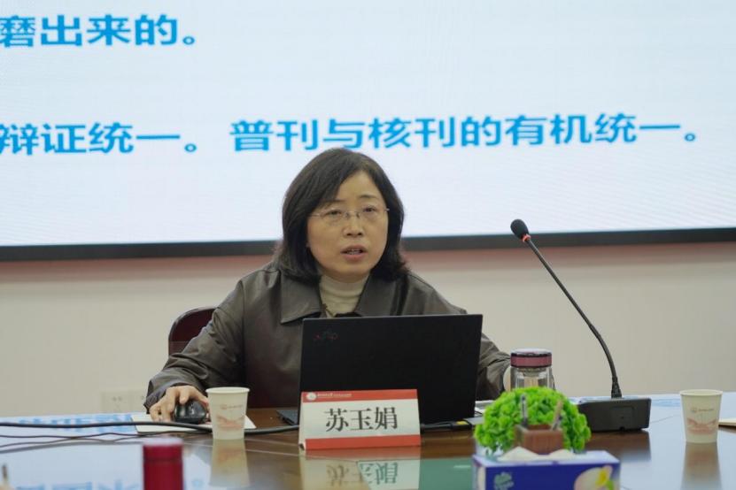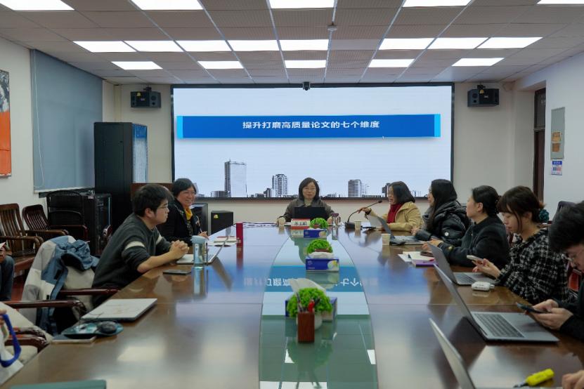 随后,苏玉娟以《提升打磨高质量论文的七个维度》为题展开分享交流。她结合自身科研经历,从七个维度系统阐述了撰写高质量论文的方法。首先,她强调了选题的重要性,呼吁大家树立正确的问题观,善于发现真问题,在关注员工动态的同时关注社会实践的需要,做到选题既有新意又有深度。其次,她指出在论文写作时要有科学的结构观以及与时俱进的时空观,确保论文逻辑清晰,兼具历史思维、发展思维、世界思维以及辩证思维。再次,她认为撰写出优秀论文还需作者具备厚实的文字观与严格的学术观。她结合实际案例,向在场师生细致传授了打磨文章的方法,并着重阐述了五个关键步骤:把好政治观、规范使用学术语言、规范引用参考文献、精准把握期刊特色、严格控制复制比。最后,苏玉娟针对人工智能时代ai写作技术广泛应用的现状,向与会者提出了树立理性技术观的建议。她强调,在充分利用AI作为高效辅助工具的同时,应继续发挥人类创造力的核心价值,避免陷入过度依赖的境地;在享受技术便利的同时,更要坚守对学术研究与创作的热情与执着,确保学术成果的质量与深度。