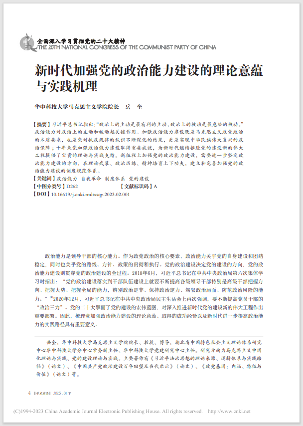 《人民论坛·学术前沿》 2023年第2期(1月下)刊发了公司岳奎教授的学术论文《新时代加强党的政治能力建设的理论意蕴与实践机理》。