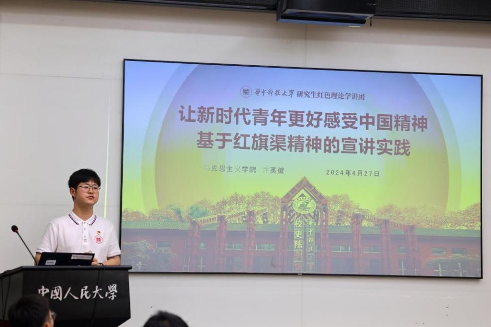 在分论坛上,公司2023级党建专业硕士研究生、校研究生红色理论学讲团讲师许英健以《让新时代青年更好感受中国精神——基于华科大红旗渠精神的宣讲实践》为题进行汇报分享,他通过回顾红旗渠工程建设时期感人至深的历史小故事,向大家阐述了“自力更生、艰苦创业、团结协作、无私奉献”红旗渠精神的实质内涵及价值意蕴。许英健同学的宣讲汇报向各高校青年师生生动展示了公司“学”“讲”结合的朋辈宣讲体系建设与探索的成就,展现了华科大马院学子的深厚学科素养和青春风采,受到与会师生的一致好评,引发热烈反响。