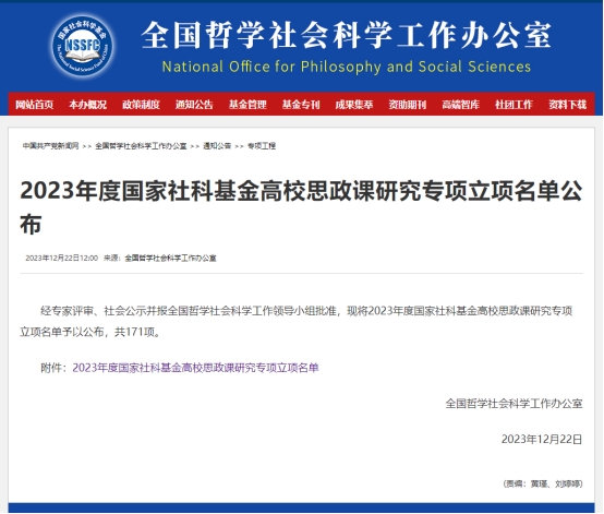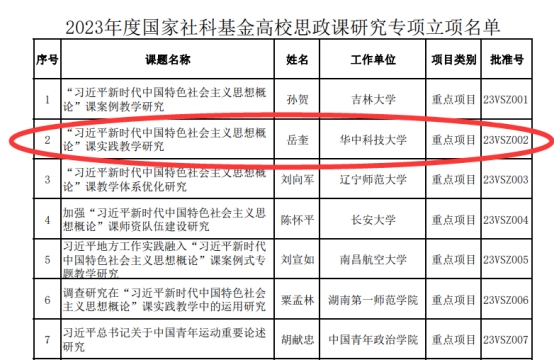 近日,全国哲学社会科学工作办公室公布了2023年国家社科基金高校思政课研究专项项目立项名单,我院岳奎教授获得重点项目立项资助。