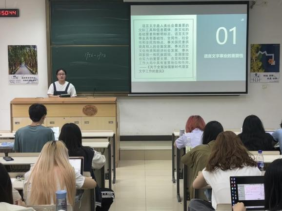 “同学们,对于汉字简化,你们了解其缘由与过程吗?《汉语拼音方案》又是如何诞生的?”来自汉语言文学专业的杜非凡同学,向同学们展示了新中国成立后在语言文字领域的辉煌业绩以及其在促进国家与社会前进中不可替代的作用。杜非凡同学用生动的例子和详实的数据,揭示了从1950年代到1980年代,通过全民扫盲运动,数亿中国公民掌握了基本的读写能力,极大提升了国民素质和社会文明程度。