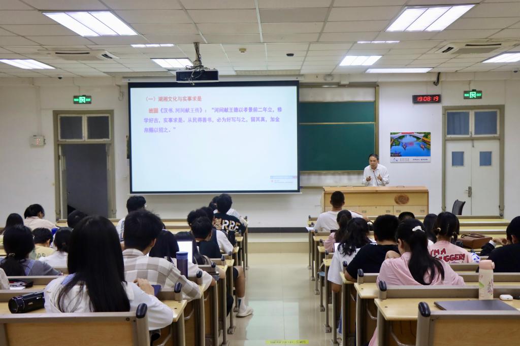 课程伊始,喻立平老师以湖湘文化与“实事求是”的深厚关系为切入点,引用自东汉到近代以来诸多学者关于“实事求是”的论述,向同学们证实了“实事求是”在中国传统文化中的重要地位。随后,他通过细致入微的讲解,透彻分析了毛泽东同志在《反对本本主义》《实践论》和《矛盾论》等经典著作中关于“实事求是”的论述,揭示了“实事求是”思想路线的诞生背景及其深远意义。