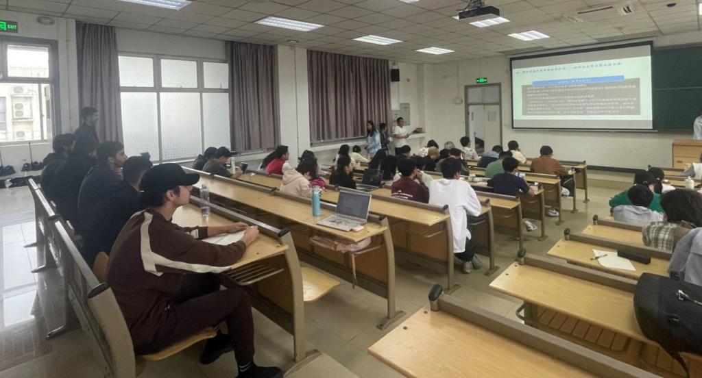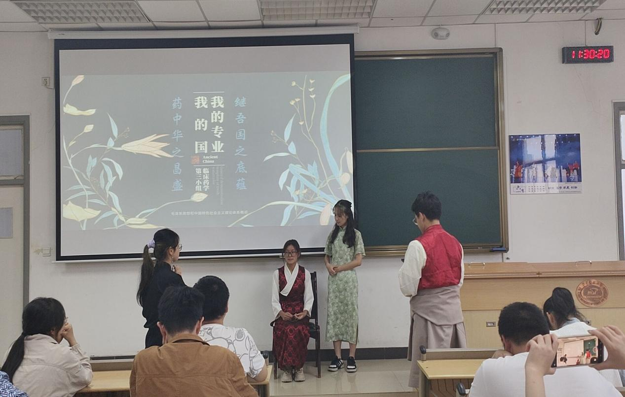 “有机化学,太难了,药学我读不下了,我想转专业。”临床药学2301班同学的情景剧“紫菀的专业抉择”,根据一个同学的经历改编而成,从刚开始被调剂到药学的担忧,亲身接触后的满怀激情,到在学习困境中萌生转专业的想法,再到受到屠呦呦提取青蒿素的激励,思量清楚,最后坚定不移做一名药员工。精彩的演绎,不仅展现了新中国药学的发展历程,还展现了新时代药员工的使命担当,赢得了持续不断的掌声。而在观众中,整个教室的最后一排,坐满了国际职工,他们本来是隔壁班的同学,正在进行课间休息,结果却被精彩的表演吸引而来。