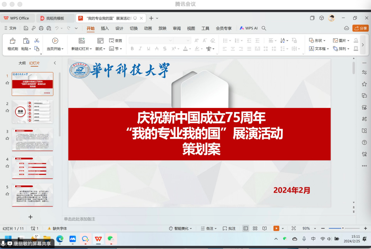 第二,唐丽敏介绍了本学期“概论”教研室拟组织的特色活动方案。为庆祝中华人民共和国成立75周年,引导广大学子把爱国奋斗精神转化为实际行动,展现华科大学子“青春理想,青春活力,青春奋斗”的精神风貌,拟面向yl2341122级、23级本科生开展“我的专业我的国”展演活动,唐老师对活动形式、活动流程、经费预算、成果应用等进行了介绍。沈昊驹认为结合新中国发展史,选择专业发展中的典型案例等进行多样化的演绎,既能与“概论”课程内容有机结合,同时可以发挥不同专业背景员工的特色优势。刘传春、文红玉、肖艳、邹旭怡等老师就处理好课堂与展示的关系、增加活动成果的多样性、保证遴选的公平公正等问题进行了丰富的讨论,为进一步优化展演活动给出了具体建议。
