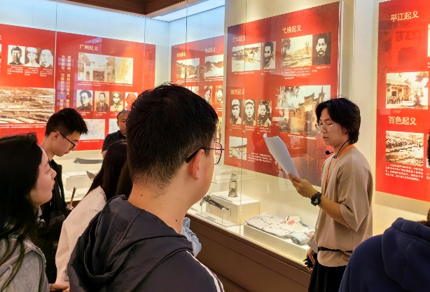 4月14日下午,在八七会议会址纪念馆的展厅里,yl23411电信2207班班长刘啸禹正铿锵有力地朗诵着:“茫茫九派流中国,沉沉一线穿南北……把酒酹滔滔,心潮逐浪高!”这是由yl23411“中国近现代史纲要”教研室教师张誉千、祝萌组织的《中国近现代史纲要》(以下简称《纲要》)课程第二课堂的实景实践教学现场,来自电信公司、管理公司的30余名员工参与了这场实践教学。