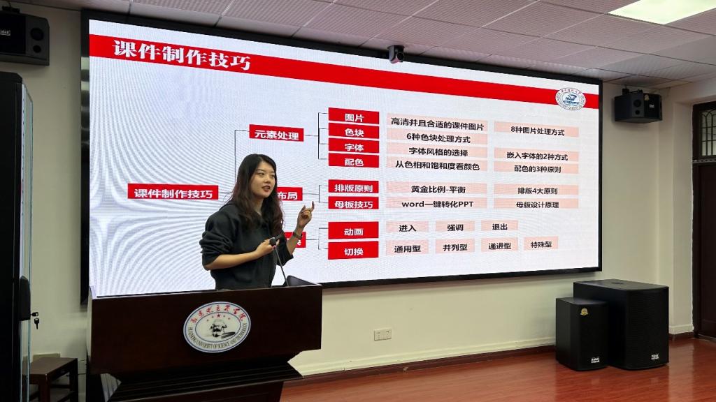 在“课件制作技巧”课程中,赵爽向在座教师分享了课件制作的经验。她指出,文字、图形、色彩及动画等组件的合理运用,不仅可以使教学过程生动直观,还有助于提高教学质量。随后,赵爽结合具体案例进行示范操作,以简单易懂的语言分享了包括元素处理、页面布局、动画切换三方面关于课件制作的实用方法。除此之外,她还强调,课件的有效表现力离不开新颖的内容、清晰的逻辑和规范的排版。