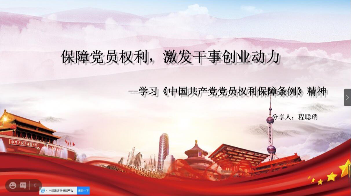 由于正值寒假,本次会议采取了线上“云课堂”的形式,由刘欣雨和程聪瑞两位同学分别讲授微党课。刘欣雨同学从抗疫故事、科技发展、乡村振兴、改革开放、国际关系等方面对习近平总书记的新年贺词进行讲解,展现了中国共产党领导下的中国人民在面临风险和逆流时一往无前、同舟共济、敢拼敢做的精神面貌和奋斗姿态。随后,程聪瑞同学通过分析《中国共产党党员权利保障条例》的内容变化,展示了与时俱进、不断完善的党的建设,和党员权利保障方面的创新性提升。党员们需要坚持权利和义务相统一的原则,切实履行党员义务,才能更好的得到权利的保障。