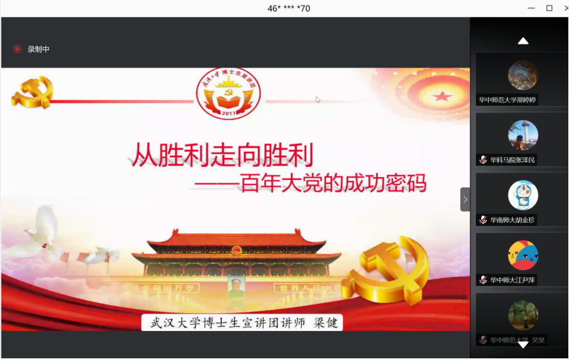 百年征程波澜壮阔、百年初心历久弥坚、百年大党风华正茂。今年是中国共产党建党100周年。习近平总书记在党史学习教育动员大会上指出,中国共产党的一百年是矢志践行初心使命的一百年,庆祝中国共产党百年华诞,是全党政治生活中的一件大事。为深入贯彻落实习近平总书记在党史学习教育动员大会上的重要讲话精神,深化“不忘初心,牢记使命”主题教育成果,引导广大青年员工党员传承红色基因,砥砺政治品格,筑牢信仰之基,以实际行动庆祝建党一百周年。2021年4月17日下午,公司硕士生第一党支部全体员工线上参加由武汉大学、海南大学联合yl23411、华中师范大学、北京理工大学、华南师范大学六校员工党支部以线上线下相结合的方式开展了以“学百年党史、守初心使命”为主题的党史学习教育宣讲会暨联合主题党日活动。武汉大学党委研究生工作部副部长左征军、海南大学研究生处(研究生工作部)副处长郑育声、武汉大学公司党委副书记秦后国、海南大学材料科学与工程公司党委副书记周郭军出席活动,来自四省六校十一个支部的300余名员工党员参加了此次活动。活动由海南大学材料科学与工程公司党委副书记周郭军主持。