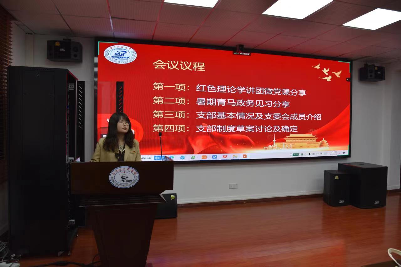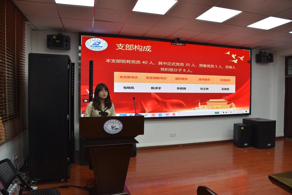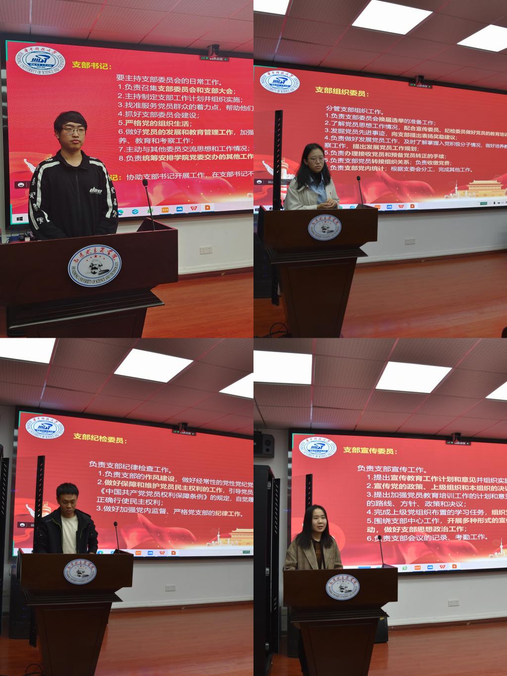 接下来,由党支部书记毛明凤同志介绍硕士生马克思主义中国化研究党支部的基本构成及支委会成员情况。她指出,纵向党支部正式成立以来各年级同志互相还不太熟悉,首先要让大家从认识支委成员开始增进交流,让“有问题找支部”这句话落到实处。随后,党支部副书记陈泽宇同志、组织委员李若楠同志、纪检委员吴鑫毅同志、宣传委员刘之琳同志依次上台进行自我介绍,并向大家阐述自己的工作职责。这也让大家对纵向党支部的基本情况和支委会成员有了进一步的了解。