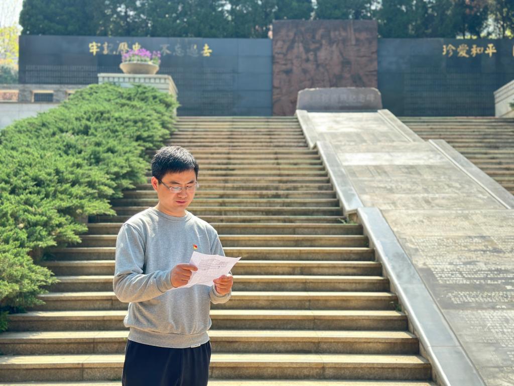 活动第二项,于武汉抗战纪念园举行本次清明节祭扫活动的祭奠仪式。首先,全体同志向烈士默哀一分钟。随后,德育导师沈孝鹏老师在烈士纪念碑前讲话,希望大家更加深刻认识到珍惜和平、弘扬爱国主义精神的重大意义。接着,郑启龙同志带领同学们重温武汉抗战历史和英雄事迹,他介绍了武汉会战的背景、过程和结果,以及武汉会战中的空军烈士陈怀民的故事。随后,德育导师唐丽敏老师带领党员代表为烈士敬献花束,同学们携带花束,依次沿石阶而上,向烈士纪念碑献花鞠躬。在烈士墓碑下,全体党员同志重温入党誓词,以铮铮誓言袒露自己向革命先烈学习的决心和牢记使命的初心。