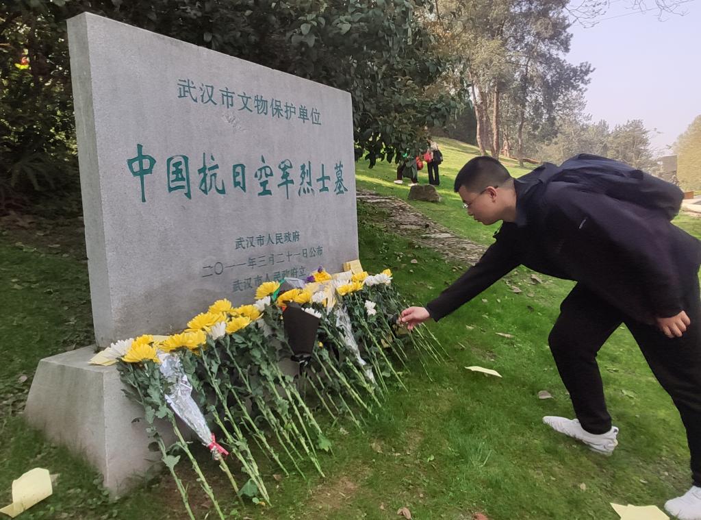 活动第三项,前往保卫大武汉中国抗日空军烈士墓,擦拭墓碑并献花。在1938年间打响的武汉大空战,是中国抗日战争史上乃至世界战争史上最著名的空中战役之一。我方以辉煌的战果粉碎了敌方“制空权”的谬论,给日军以沉重打击,鼓舞了全国军民的抗战斗志。