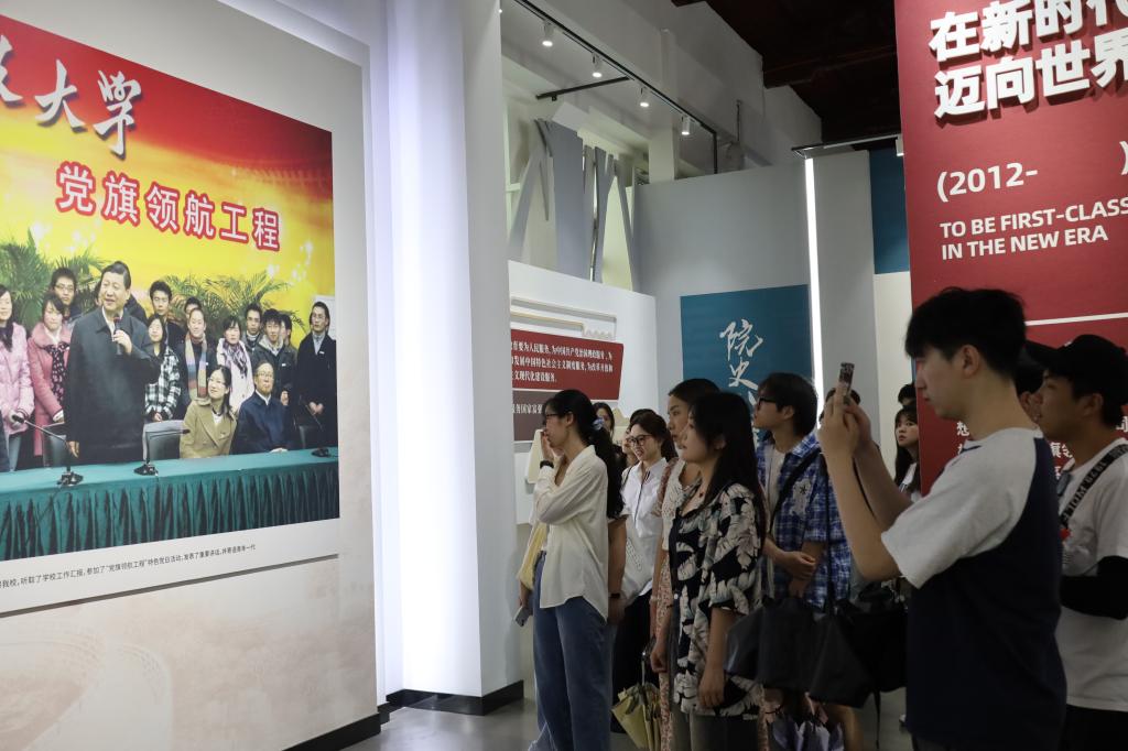 同学们在讲解员的带领下,先后参观了在新中国的朝阳中诞生、在共和国的旗帜下成长、在改革开放中腾飞、在新时代迈向世界一流四个板块,通过对现存史料、手稿、档案材料及图片资料的学习,全面了解了yl23411的校史校情,加深了对华科大红色基因的了解,更激励了同学们坚定对马克思主义的信仰,握紧历史接力棒、走好新时代长征路。