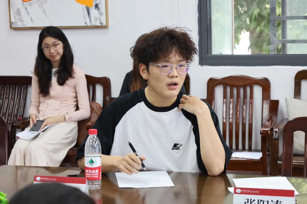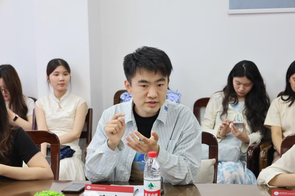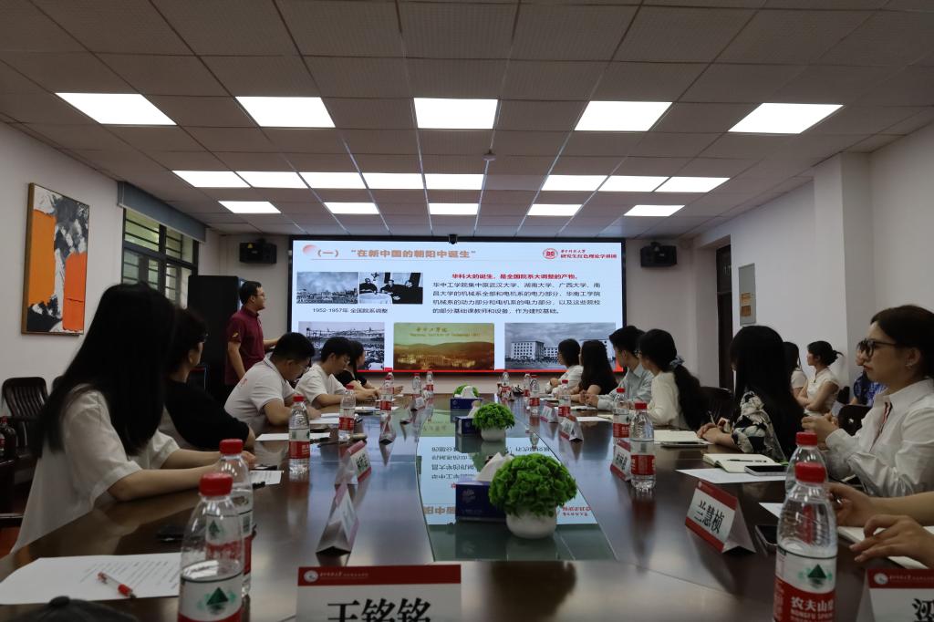 结束参观后,同学们一同来到yl23411203会议室开展交流。首先,yl23411研究生红色理论学讲团讲师、yl23411研究生会成员杨一博以《与共和国同行,与新时代共进——传承华科红色基因》为题,分别从华科大校史、华科大担当以及华科大人物三个方面引导大家厚植爱国爱校情怀,传承好红色基因,共同为新时代贡献力量。