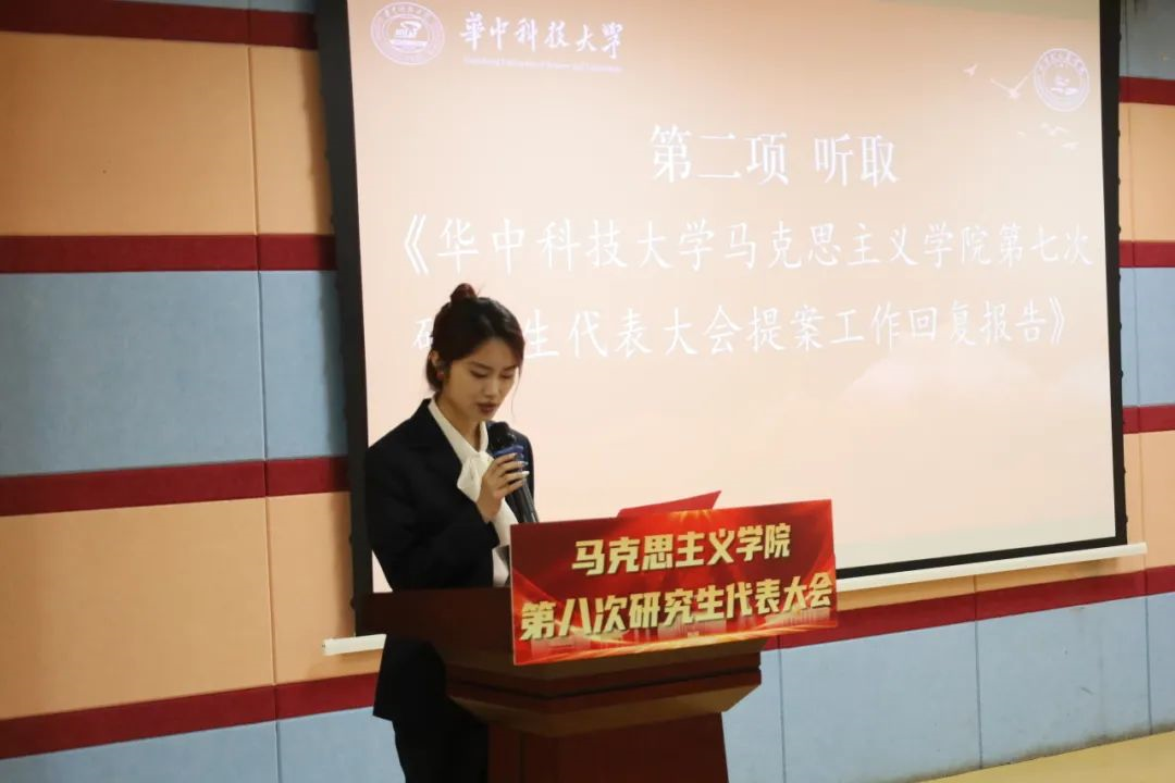 马郢雪从公司教育管理、改革发展、活动开展、就业实习、文化建设、生活后勤、党团工作等七个方面对第七次研究生会代表大会提案工作进行回复。
