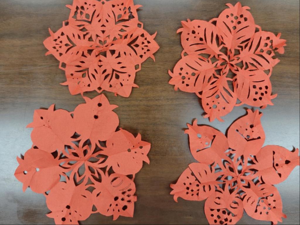 活动第三项,石榴花剪纸活动,团支部书记周芮含给同学们分发了纸张和剪刀,带领同学们一起裁剪“石榴花”。