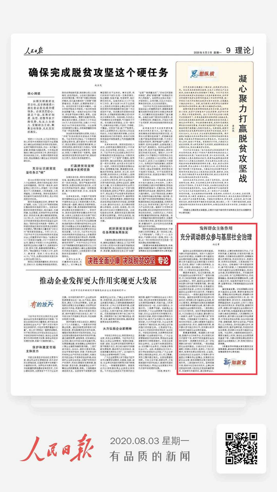 2020年8月3日,人民日报理论版刊登公司杜志章教授《充分调动群众参与基层社会治理》一文,文章对我国的基层社会治理进行了深入探究,文章的主要内容包括: